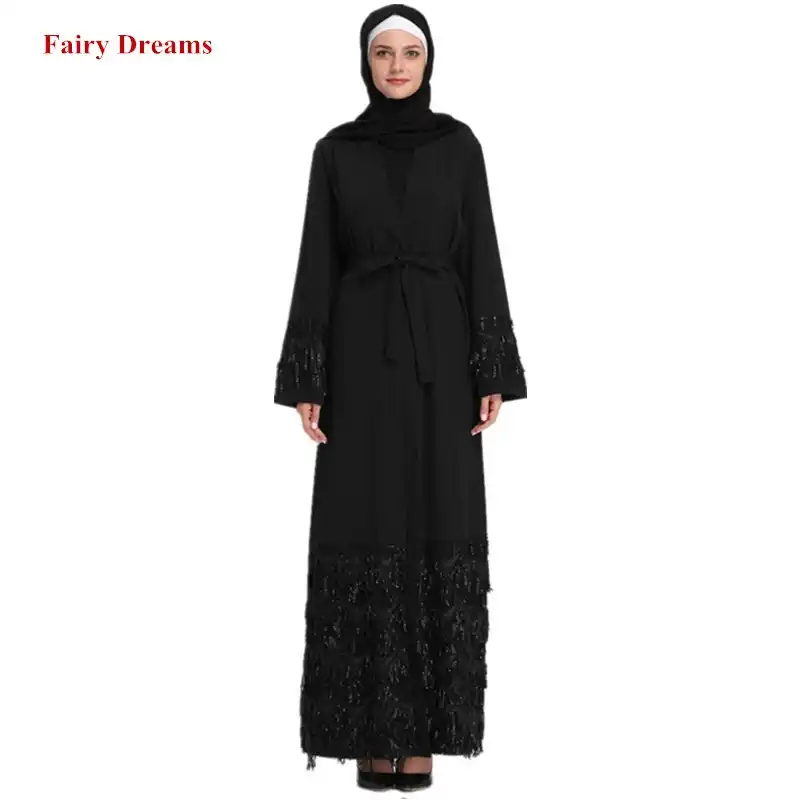 وردي رمادي أسود عبايات للنساء دبي ضمادة معطف ترتر مسلم قفطان طويل كارديجان بوليرو الحجاب الملابس الإسلامية الحجاب Aliexpress